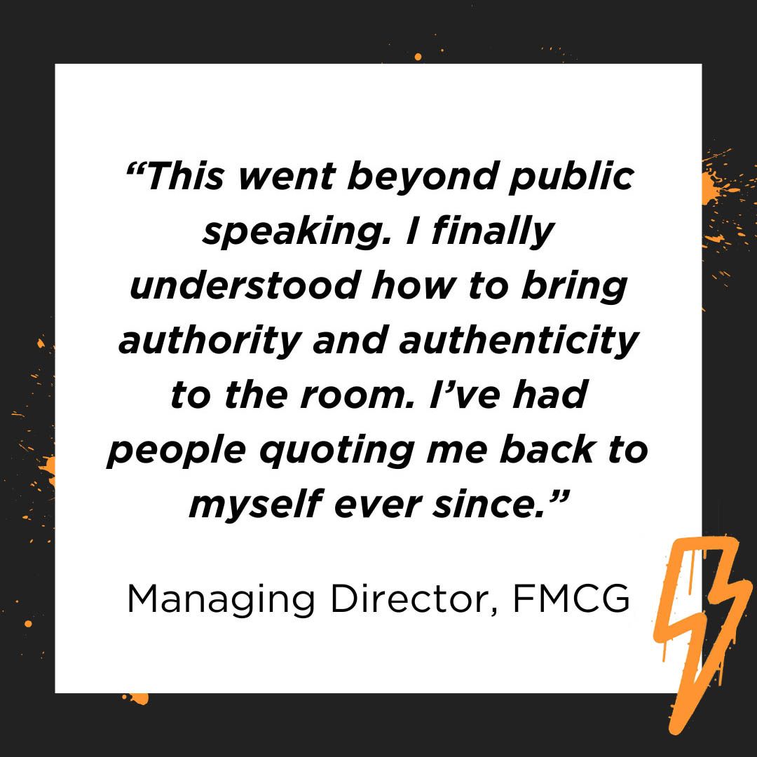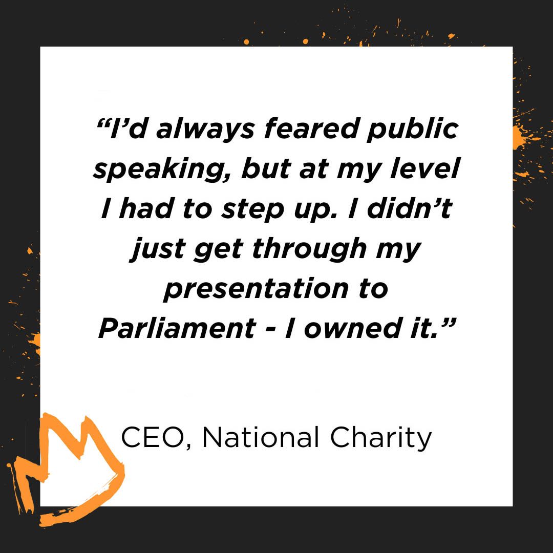 Whether it's Parliament, an SLT away day, a high-stakes pitch or an awards stage, this 4-session package will help you to own the room.